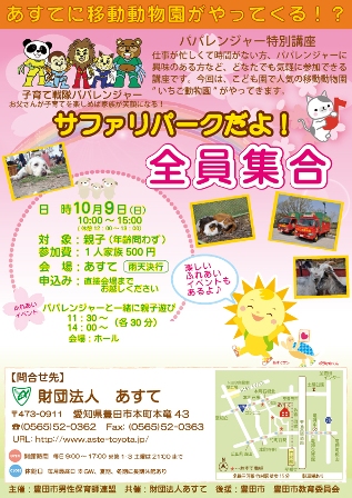 10月9日(日)、あすてに移動動物園がやってきます。かわいい動物達と触れ合うことができますよ☆