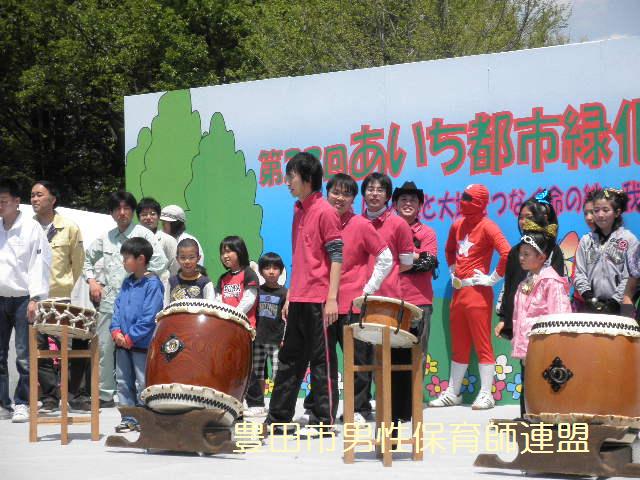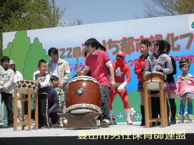 今回、このイベントを担当するのは、打激師の朗(ほがら)さんです。芸名を雅(みやび)というそうで、超かっこいいイケメンでした。朗さんは10日前にお子さんが産まれたそうで、名前が『太陽』だそうです。お?どこかで聞いた名前だぞ。いやぁ、素晴らしい名前だ。素敵な子になること間違いなし!と僕は確信しておりますよ(笑) 緑化フェアは29日に名古屋市の大高緑地公園であります。ぜひぜひ、家族で遊びに来てくださいね☆ 最後に、ずっとたたいてみたかった太鼓をたたかせてもらいました。すごい音でした。かっこよかった!