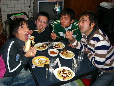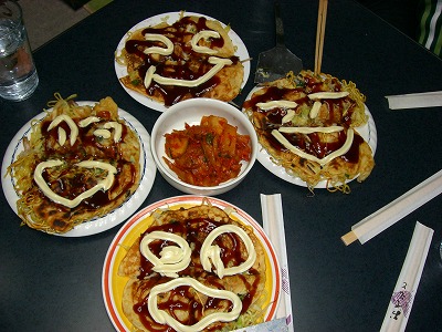 夕方に、今度の土曜日に結婚する友達の余興練習をしました。どんな余興をするかって?それはナイショ~!って写真をつけときます。でも、このブログをその友達が見たらばれちゃうなぁ・・・。あと一週間見られませんように。練習が終わったらまこちゃん(中根園長)の奥様がお好み焼きを焼いてくれました。もうおいし~んです。みんな3枚ずつたいらげました。焼きそばも食べました。どんなけでもお腹に入っちゃいました。せっかくなのでお好み焼きに顔を描いちゃいました。みんな大満足でおうちに帰りました。お好み焼きのおみやげを片手に持って・・・。お好み焼き万歳!