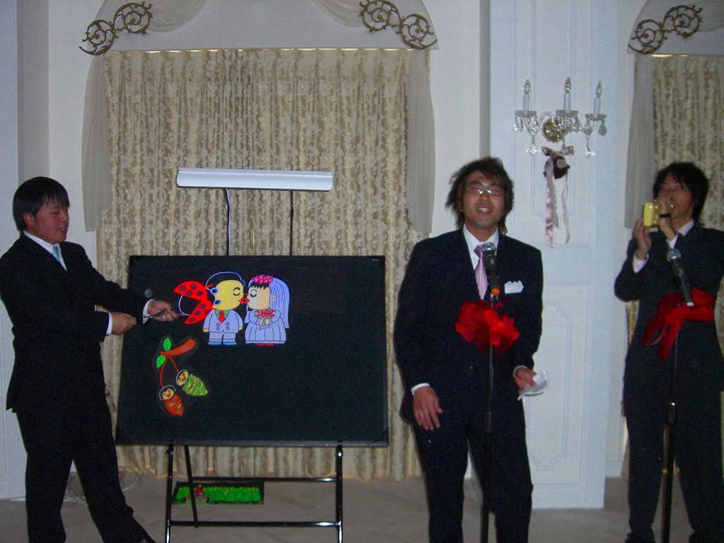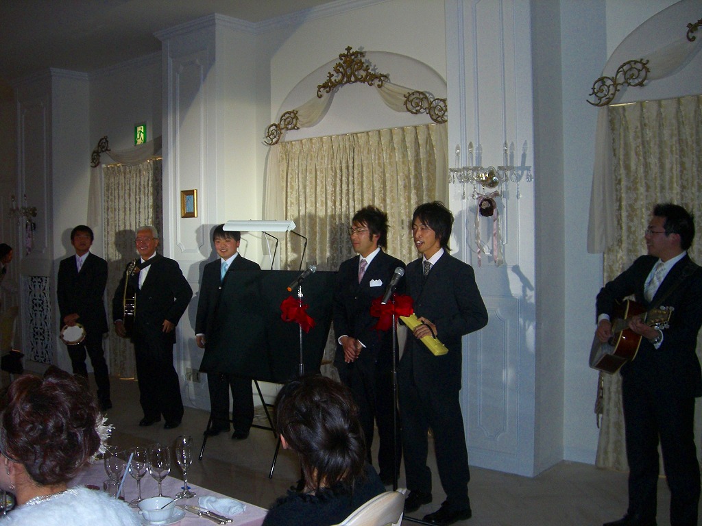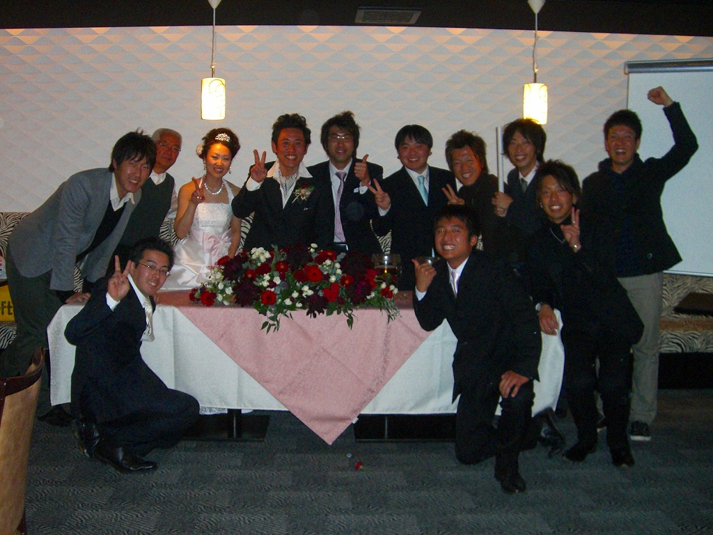 結局、「1年お疲れ様~」「来年も頑張ろうぜ~!」なんて言葉も忘れてただの飲み会みたいになっちゃいました。なので、今年は新年会もやります。ちゃんとみんな来いよ~!!連絡は早めにくれよ~!! ←ありらん食堂はおいしいです。僕はビビンバも大好き! 木下雄介先生が13日(土)挙式を行いました。終始笑顔でとても幸せそうでした。この日は余興の打ち合わせがあり、ちょっと早めに行かなければいけなかったので、みんなで8時に集合しました。しかし、いつも真面目に一番に来ている優等生K先生が10分過ぎても来ない。すると、電話がかかり、「今起きました~!」って。みんな「ナニ~!!」でした。ルートを大幅に変更しK先生を迎えに行ってから行きましたが9時半の打ち合わせ時刻には遅刻してしまいました・・・。余興は前日も練習したこともあり、打ち合わせ時もばっちしでした。 素敵な披露宴が終わったあとは、男性保育師のメンバーも増えて2次会。ビンゴでは、みんな色々な景 雄介先生お幸せに~!!