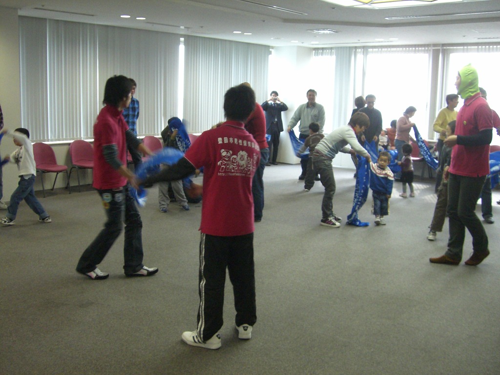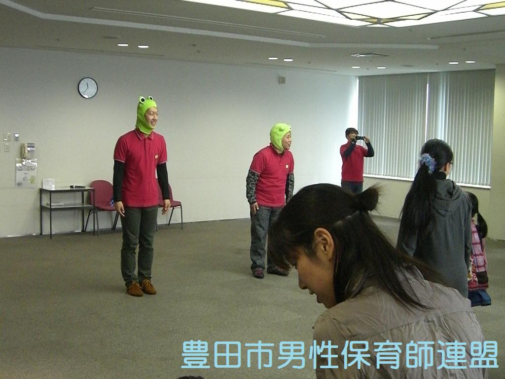 ②それにしてもこの会場、僕が一番驚いたのがトイレ。なんという開放感あふれるトイレなんでしょう。下半身以外は全部外から丸見えなんです。こんなの初めてで、今まで一番気持ちよくトイレを終えることができました。刈谷市産業振興センターに行ったらまずはトイレです!ちなみにここは6階ですが、上に行けば行くほど景色も絶景だと思います。あ~気持ちよかった。 ③さて、いよいよ報告会ですが、僕達豊田市男性保育師連盟はトップバッターです。まずは、保育士らしく導入で手遊びから入りました。確実に会場があったまりましたね。たぶん。練習通り10分を有効に使い、無事に報告を終えることができました。 そしてクライマックスは僕達の親子遊び。いつも本番に色々思いつくんですよね。演出を。登場はこうしようとか。「このタイミングで呼んでくださいね」って。それにすぐ臨機応変に対応できてしまうのが保育士ならではというか。やっぱり保育士は演出家でなくてはね。子ども達もすぐに和めたんじゃないかな。たぶん。本当にあっというまの30分でした。パパレンジャータオルは、今日一番の人気者でした。そして、とても大活躍してくれました。皆さん、ぜひ家庭でも使ってくださいね。 あと、今日はいろいろな方との出会いがたくさんあり、輪が広がりました。やっぱり、出向くのって大事ですね。世界が広がります。今日ほど「名刺が欲しい~!!」って思ったことはありませんでした。今年の最初の課題です。みんなで名刺作りをするぞ~!あっ、そんなことより僕は紙芝居作らなきゃ…。 以上で今日の成果報告を終わります。 ありがとうございました。 ←右②トイレからの絶景。もう開放感いっぱい!! ↓下③成果報告会の様子と親子遊び