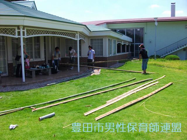 7日(日)、パパレンジャー同窓会のパパ達が20日に行われるパパレンジャー第2弾「火と水の祭典」に使われる流しソーメンの土台を作って下さいました。ありがとうございます!!な~んと、本当に竹を切る所からのスタートです。そして、このイベント、子ども達が普段なかなか使えない“ノコギリで切る”という体験を楽しんでいたようです。これも、園ではなかなかできない経験ですね。そして、実際に行った流しソーメンでは、子ども達は大はしゃぎであっという間に完食だったそうな。 僕は、日曜の休日出勤で行けなくて残念でした。暑い中、本当にありがとうございました。これで、20日のパパレンジャーも楽しくなること間違いなしです!! あっ、夜の飲み会楽しかったですね。いつもよりちょっとこじんまりと男の話で盛り上がりました♪ まだ、写真は数枚しかありませんが、後ほど、パパレンジャー同窓会のHPの方へ掲載して頂く予定です。お楽しみに☆